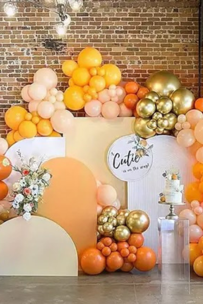 Pair it with layered balloon clusters in matching tones to frame the space.