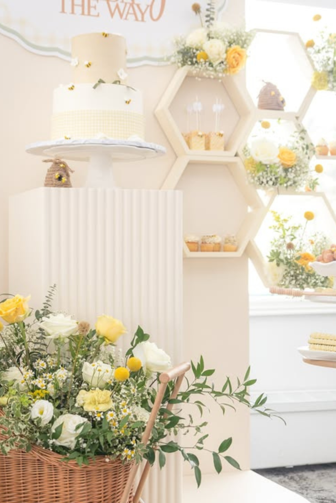 Instead of covering everything in bee prints, use honeycomb shelves, small bee cake toppers, and natural florals to keep it elegant.
