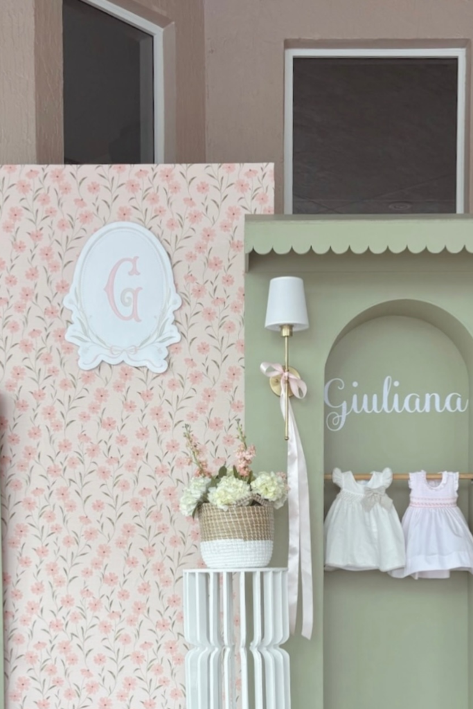 This setup works because it feels like stepping into a storybook-floral wallpaper, muted sage panels, and delicate baby dresses on display.