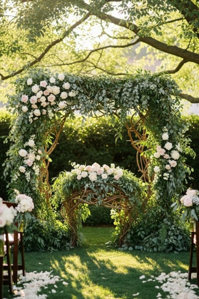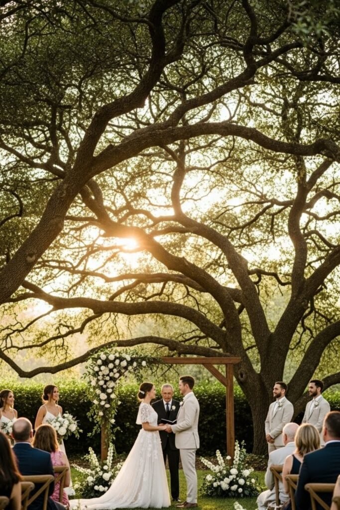 If you have mature trees, you have to position the altar where branches frame the couple naturally during vows beautifully.