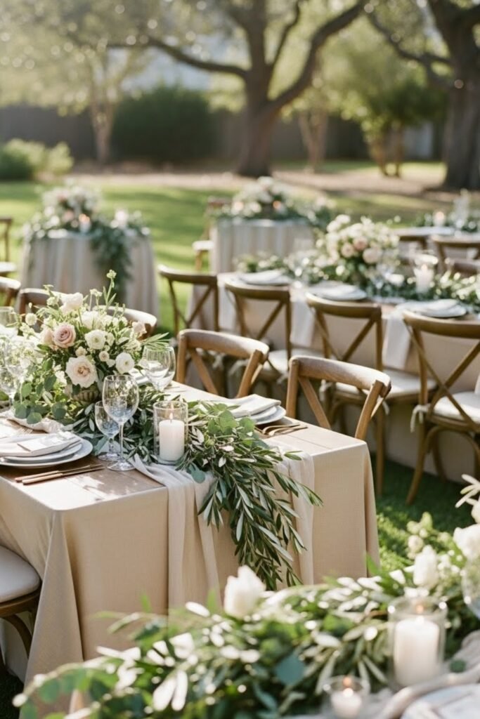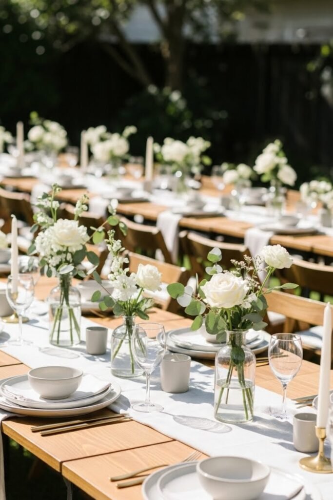 What brought calm to the design was minimal florals, because fewer arrangements let the backyard shine naturally without visual overload.