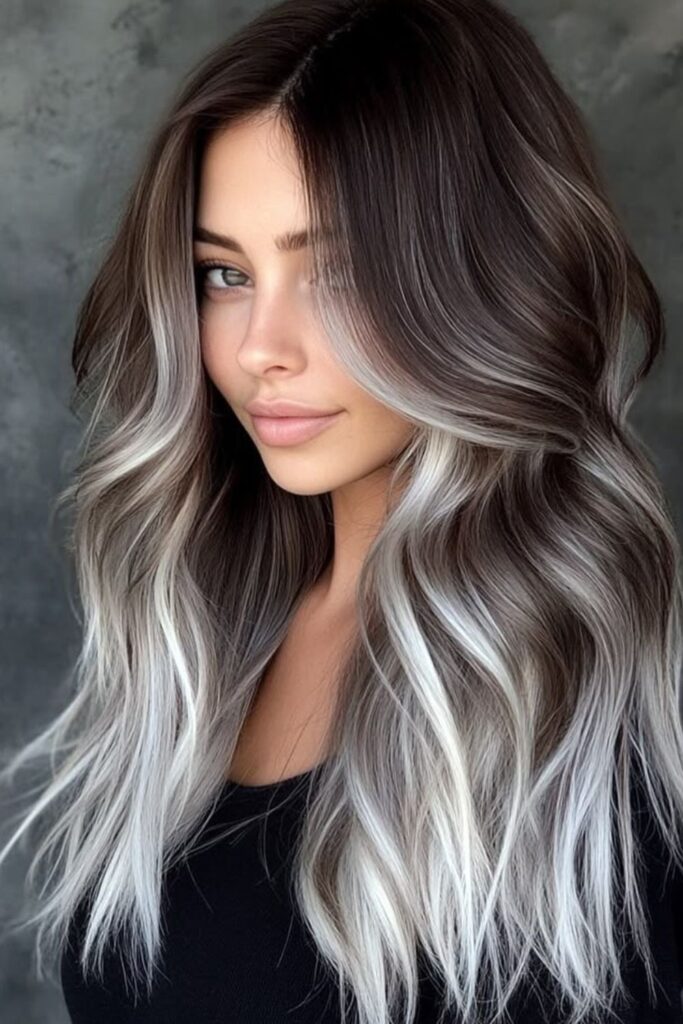 Long, flowing layers with a dark-to-silver balayage bring depth and richness to thin hair.