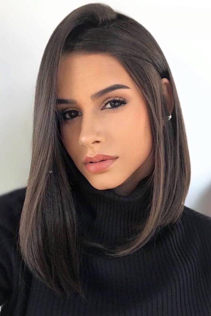 The length flatters the collarbone, while the clean center part keeps the style elegant.