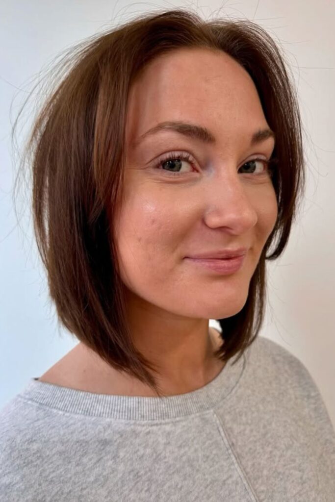 The longer front elongates the face, while the shorter back adds structure and subtle volume.