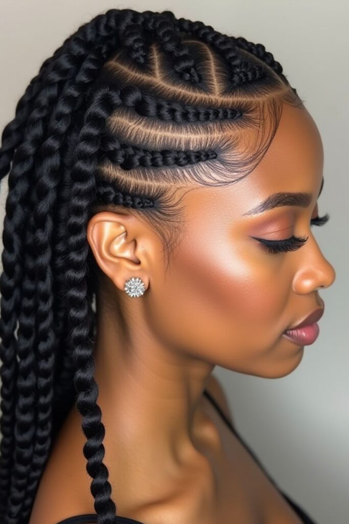 The clean parting enhances the definition, while the medium-thickness braids provide a balance of boldness and elegance.