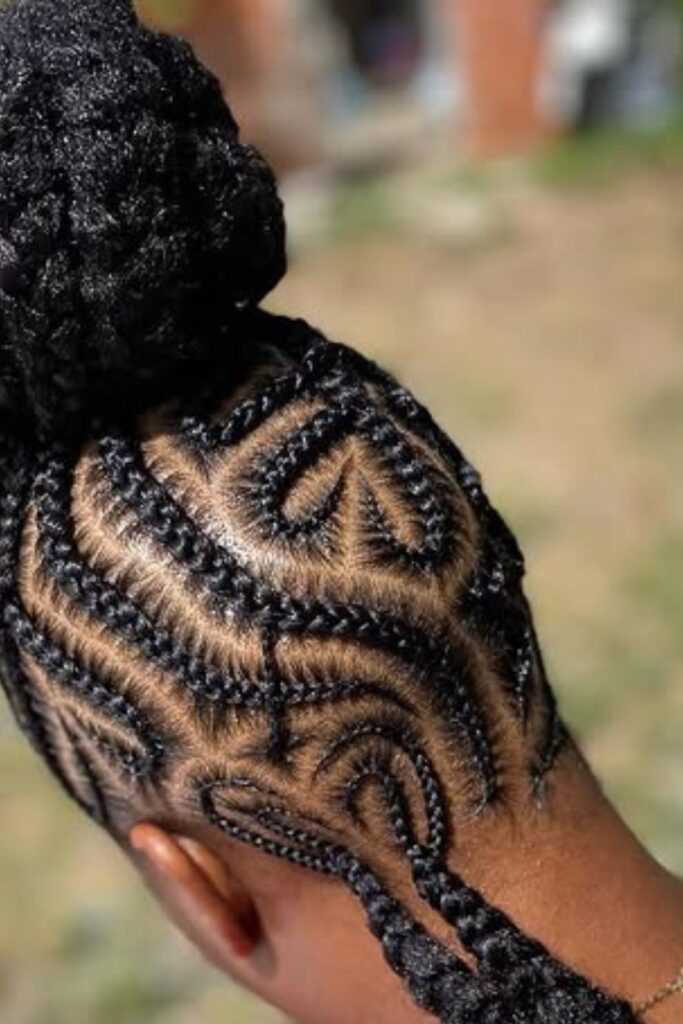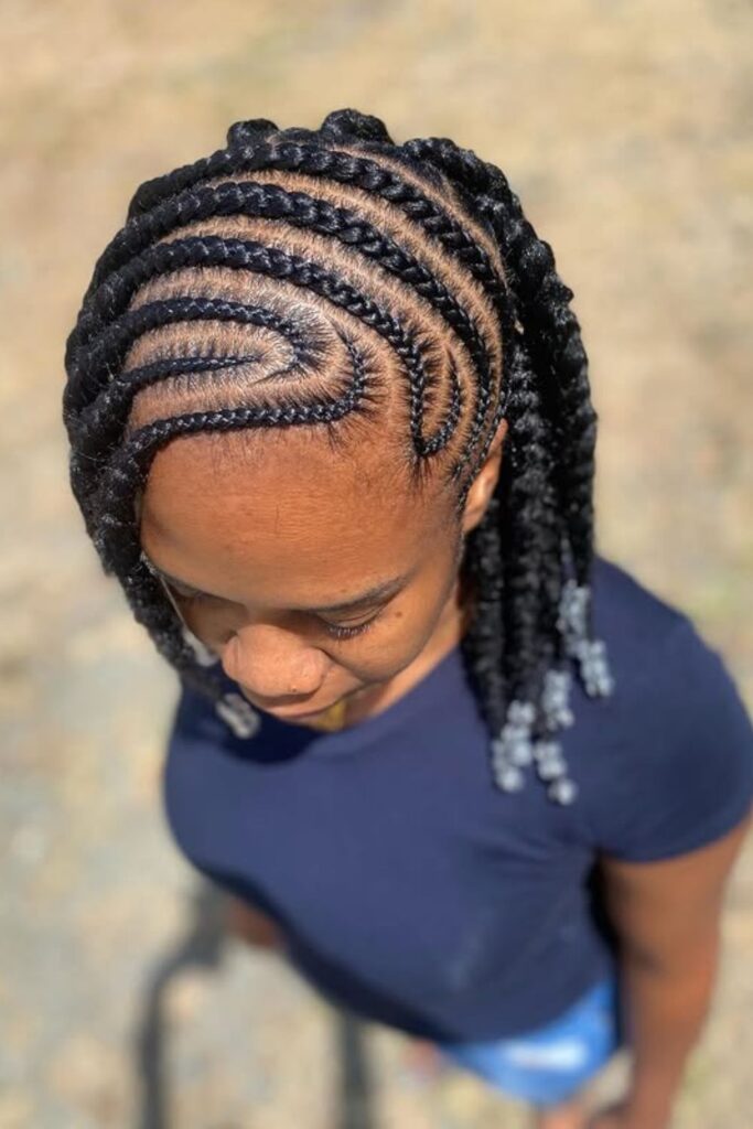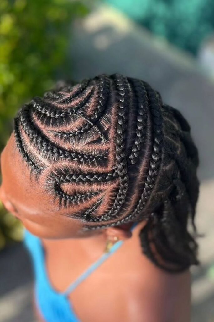 Spiral flow braids create a mesmerizing pattern of curved and linear cornrows, giving a sense of movement and depth.