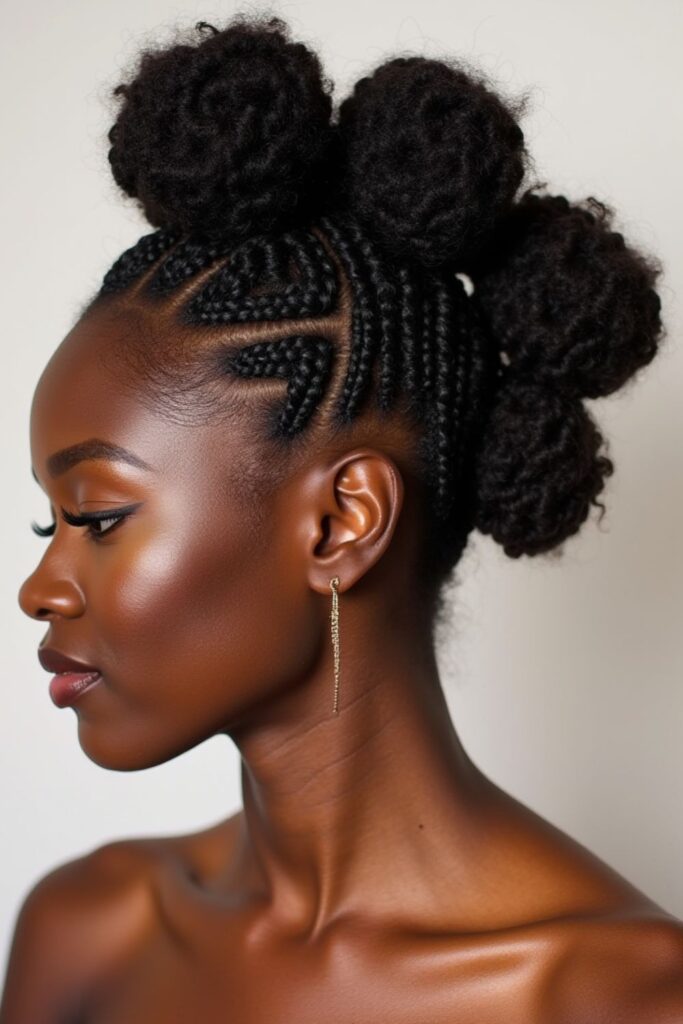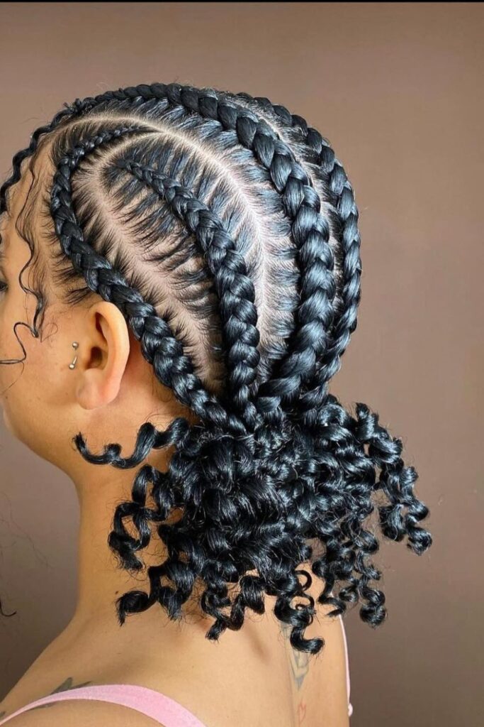 A curly braided bun blends sleek cornrows with voluminous curls, adding texture and movement to the look.