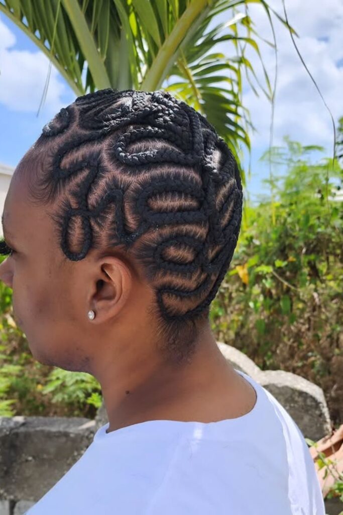 Abstract swirl braids create an artistic and unpredictable design with bold looping patterns across the scalp.