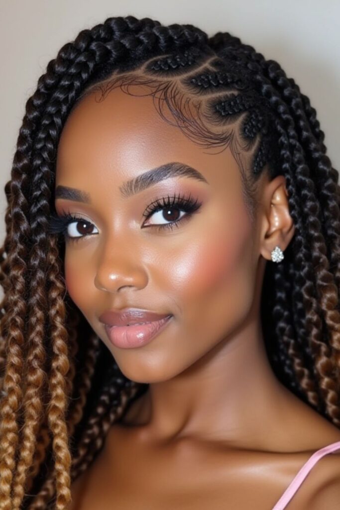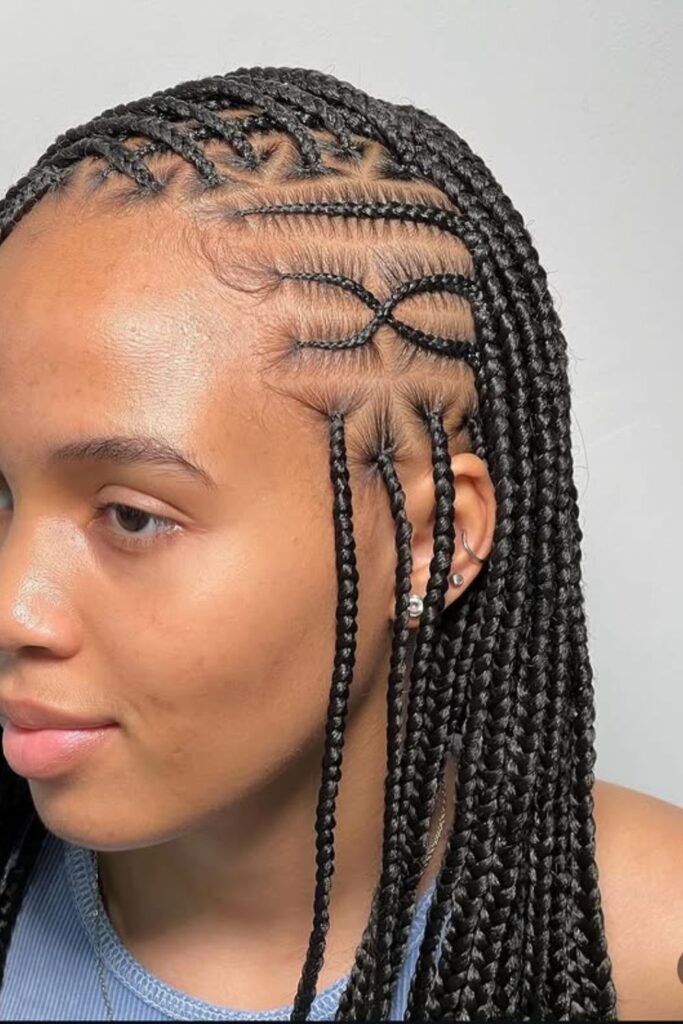 Knotless braided edges give a modern and delicate touch, blending traditional box braids with intricate micro-plaits.