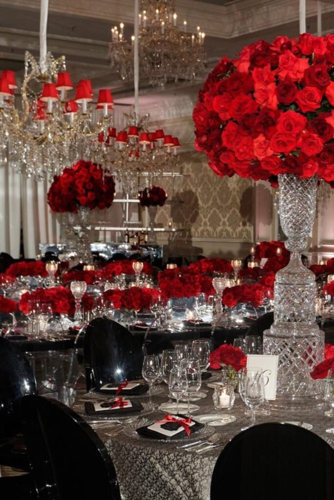 Tall red centerpieces instantly elevate a ballroom, especially when crystal and black details reflect light instead of absorbing it visually beautifully.