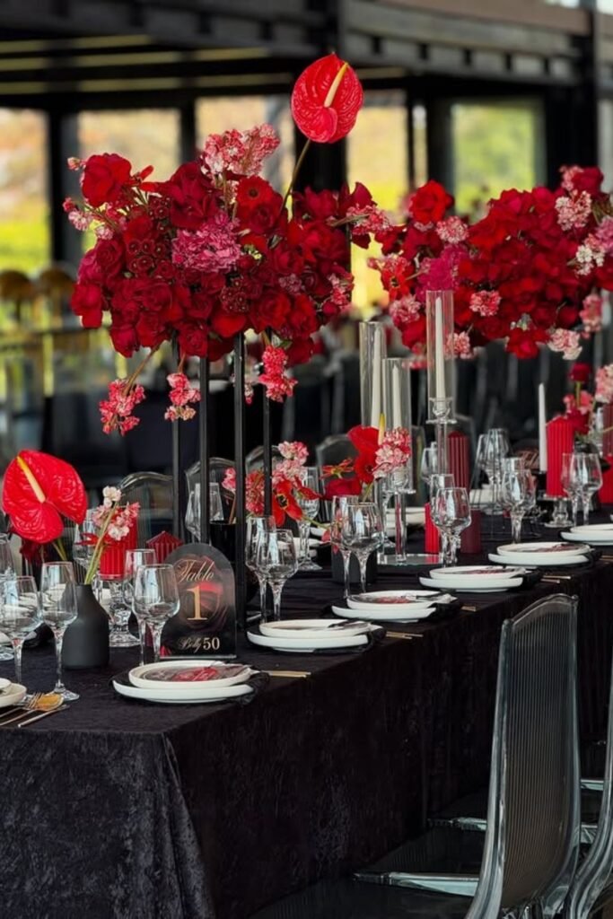 When black anchors large areas like linens or backdrops and red appears in controlled accents, florals, candles, or stationery the look feels elegant, intentional, and guest-friendly