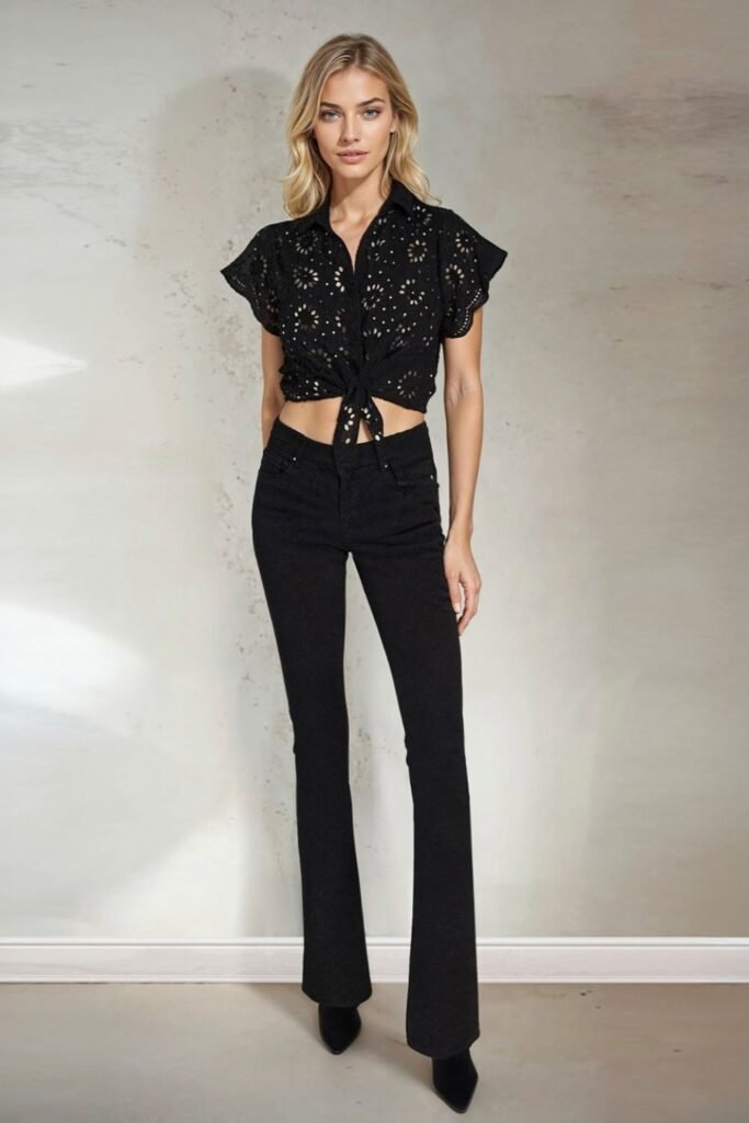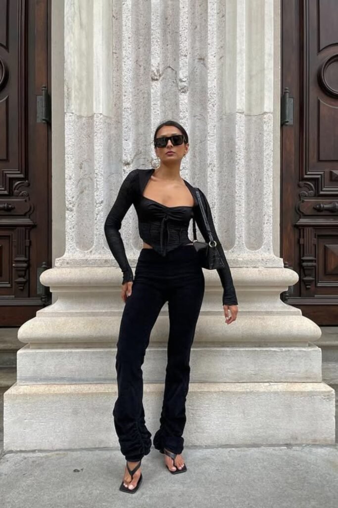 Choose high-rise black flares, a lace or eyelet shirt knotted around the waist, and pointed heels to maintain the shape slim and high.