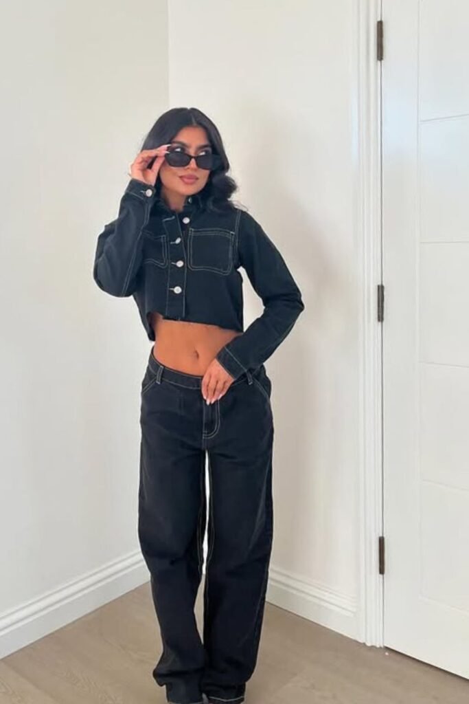 Choose straight black jeans with seams that show, a cropped denim jacket, and chunky sneakers or heeled boots to recreate the look.