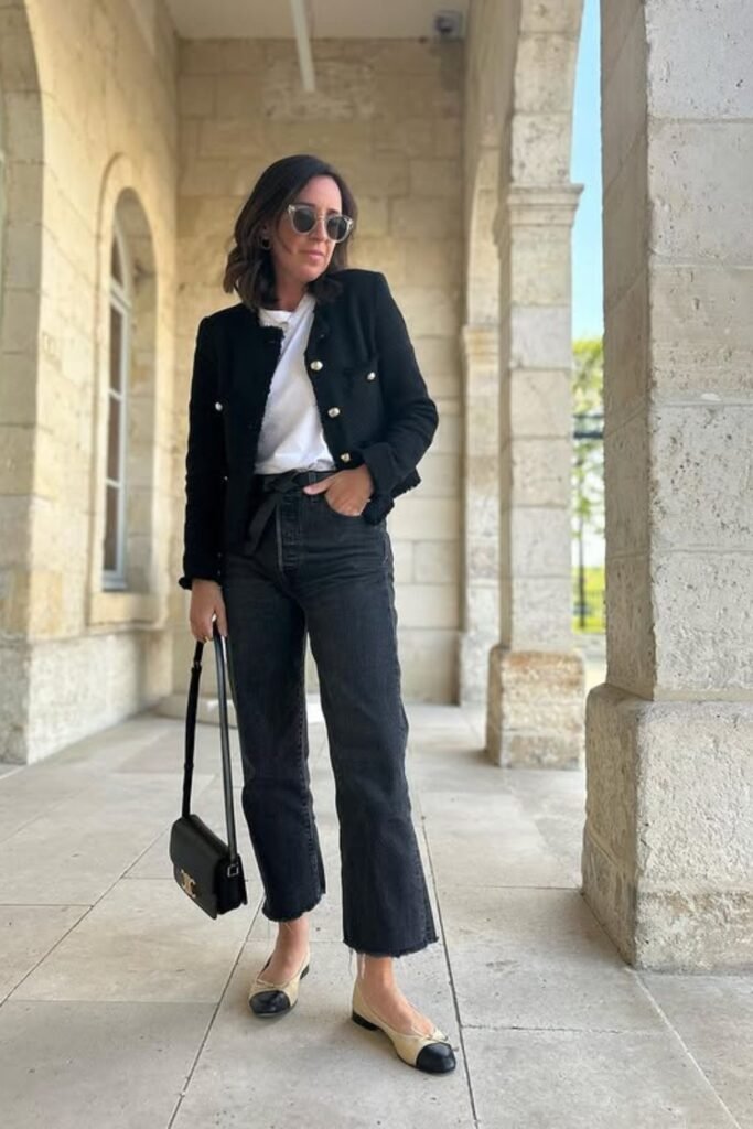 To get the look, wear straight black trousers with a plain white tee, a short black jacket on top, and classic ballet flats with a small shoulder bag.