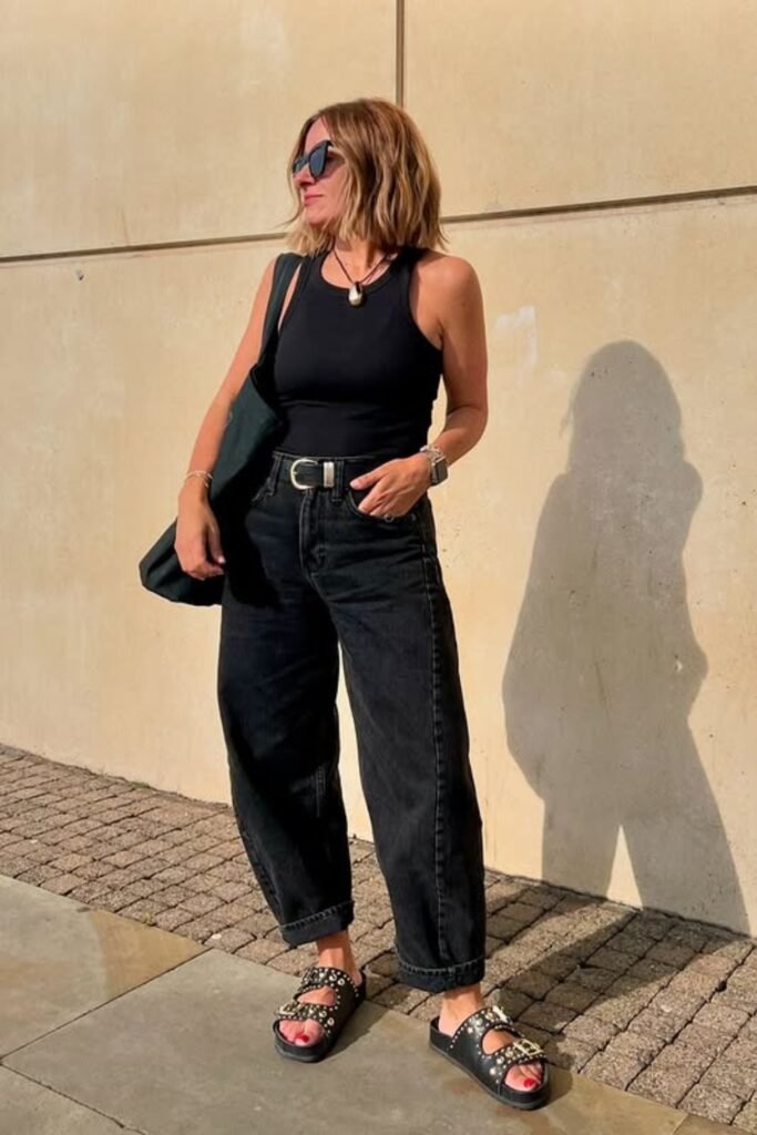 To get the look back, wear straight or balloon-fit black jeans with a racer tank top, tuck it in a little, and complete with bold sandals and sunglasses.