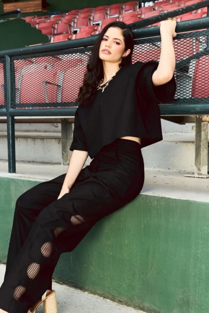 The big, cropped tee keeps it casual, and the black pants with mesh cutouts provide a fun, trendy touch.