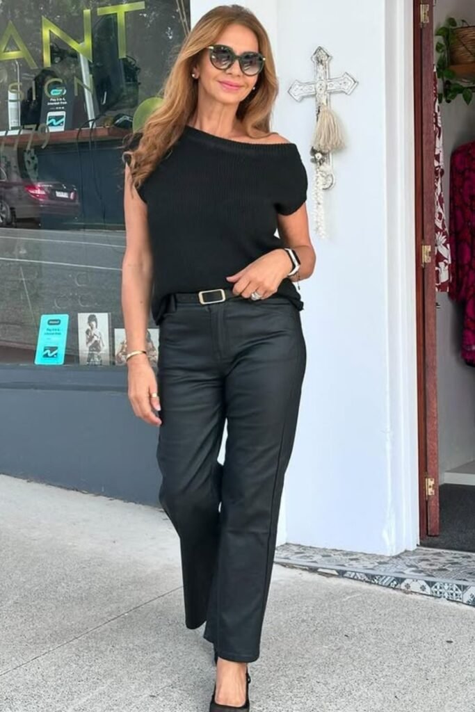 The straight-cut black trousers keep the look rigid, while the off-shoulder black knit top adds style.