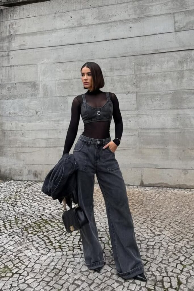 The sheer black mesh top under the cropped denim bustier provides texture and contrast, while the loose black trousers keep things casual.