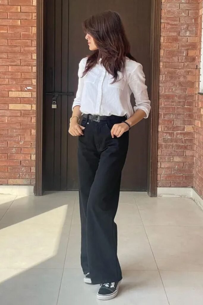 Black jeans look best with neutral colors like white, beige, gray, and camel. These colors make a crisp contrast and keep the outfit balanced.