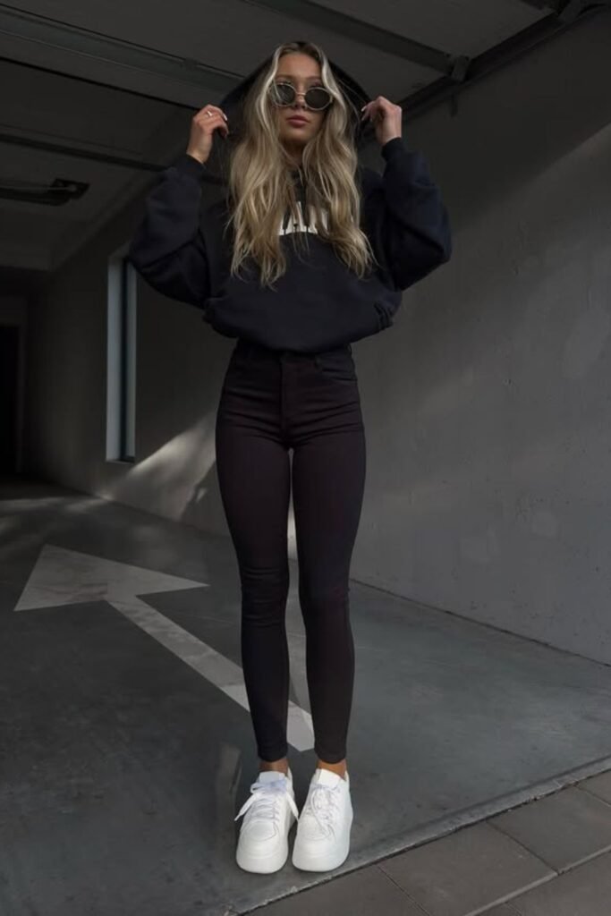 This hoodie-and-skinny-jeans outfit is the best for days when comfort comes first but style is still important.