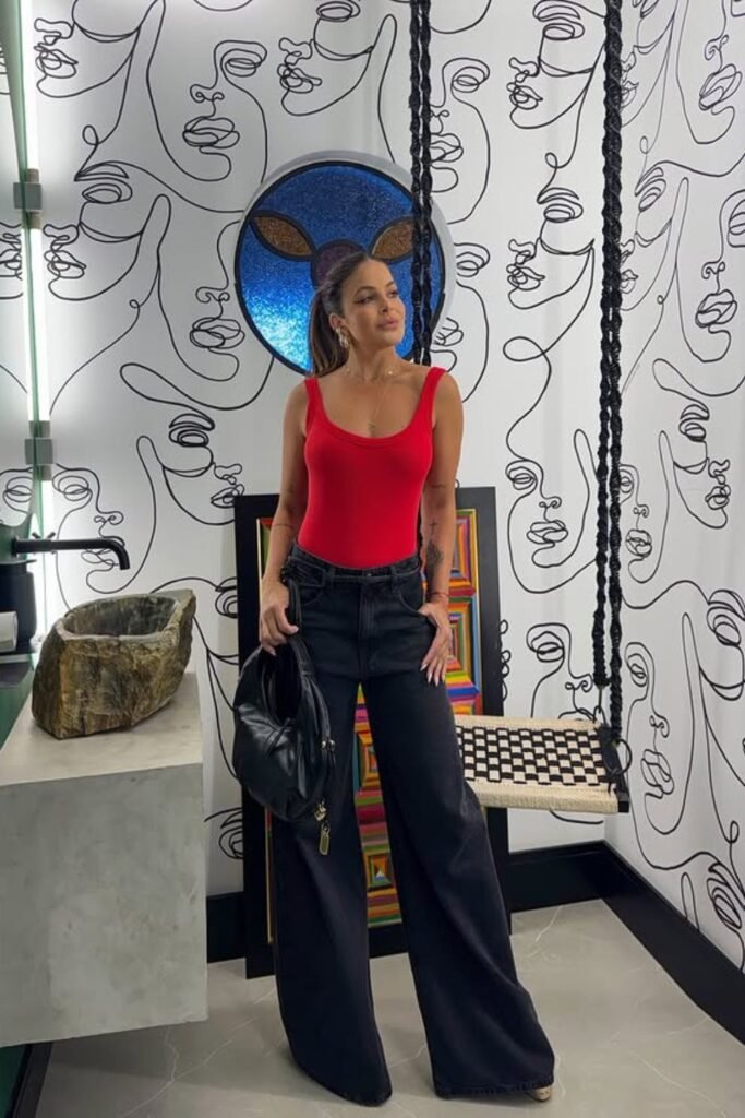 The red tank top instantly brightens up the black wide-leg jeans, making a bold but easy outfit.