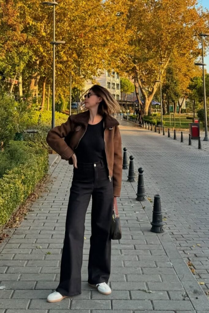 To get the look, wear a fitted black top under a brown jacket, tuck in high-waisted jeans for structure, and finish with white sneakers for a casual yet put-together look.