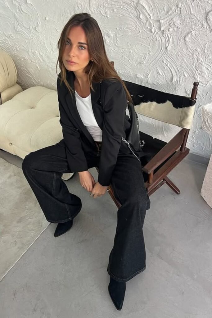 The structured black blazer and fitting white tee keep everything neat, and the wide-leg trousers and stiletto boots add style.