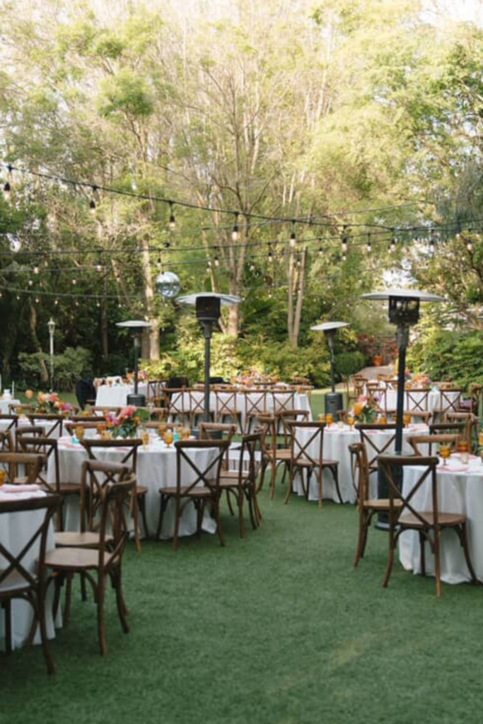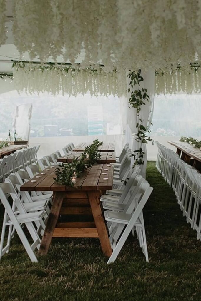 This setup works well for long wooden tables, overhead greenery, and soft lighting without risking weather-related disruptions.