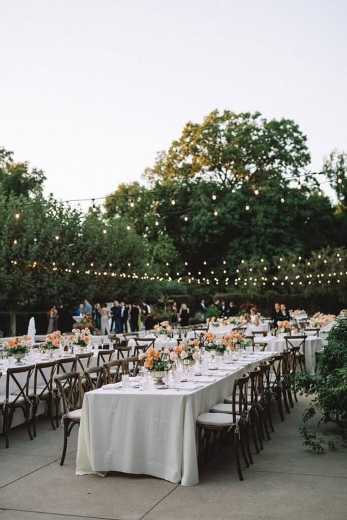 Long reception tables under string lights turn open garden spaces into intimate dinner zones guests actually linger in after sunset together.