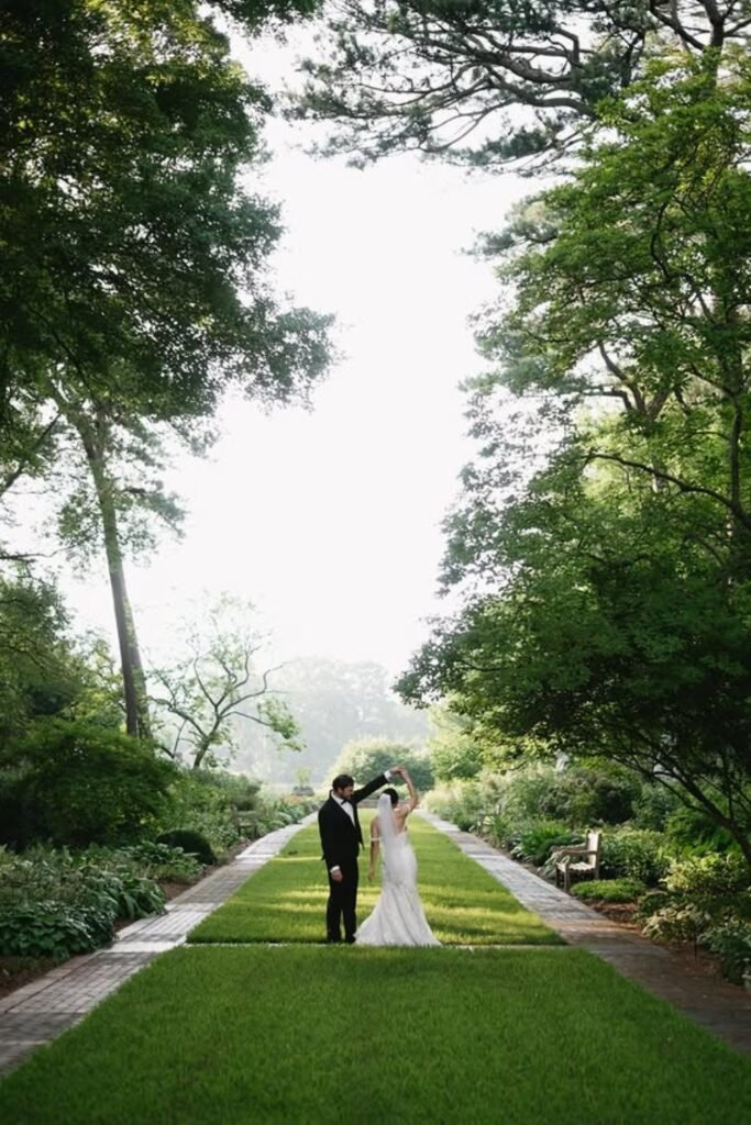 Wide garden paths create effortless portrait moments, especially when trees frame the couple naturally during quiet post-ceremony photo sessions together.