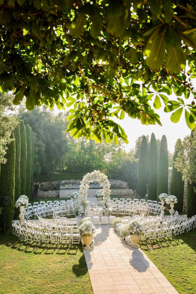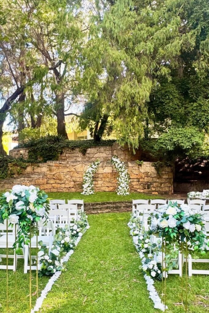 This setup is ideal when gardens feature walls or terraces that already anchor the ceremony area without added structures or drilling required.
