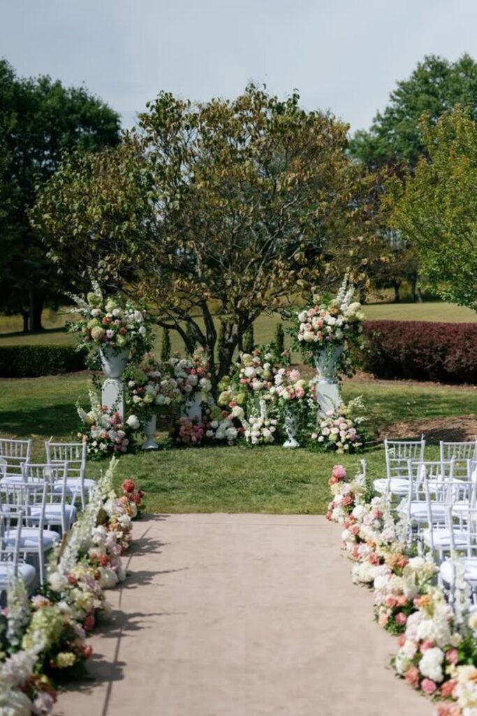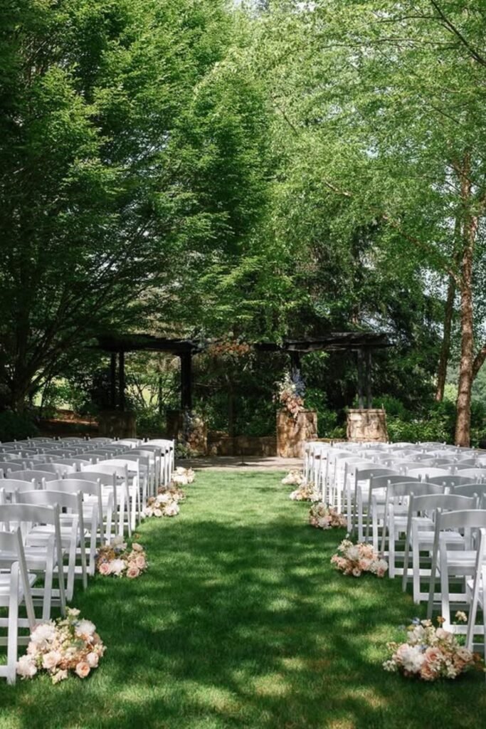 Choose blooms matching surrounding greenery so the aisle enhances the space instead of competing visually with nature, trees’ overall design.