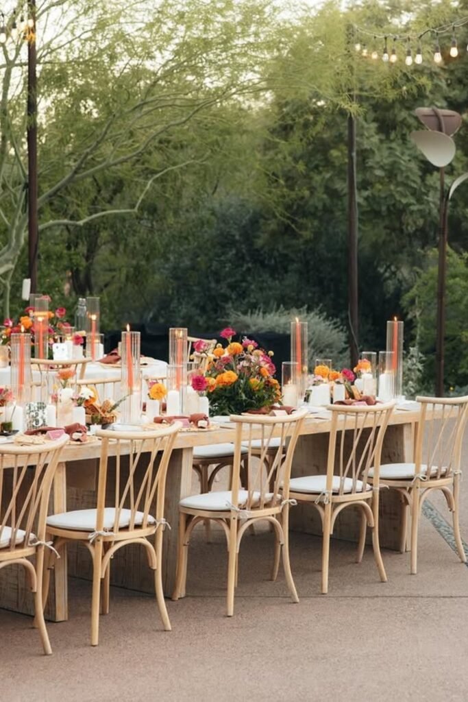 If you want elegance without excess, choose matching florals and simple stands to keep everything intentional and clean for outdoor weddings.