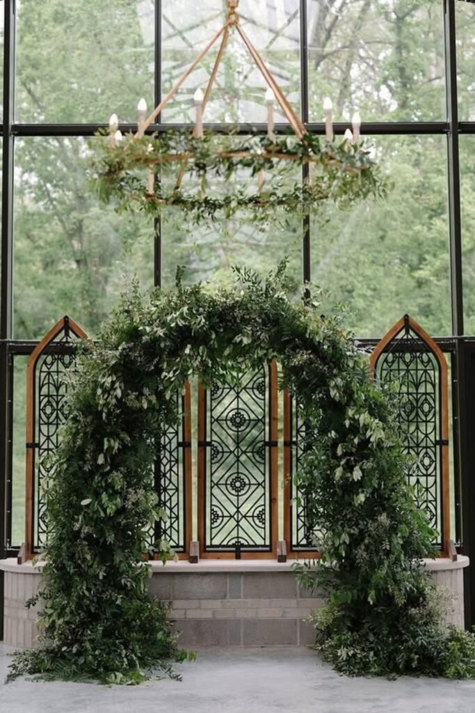 Greenhouse ceremony arches allow lush installations without weather stress, giving couples control over florals and lighting conditions.