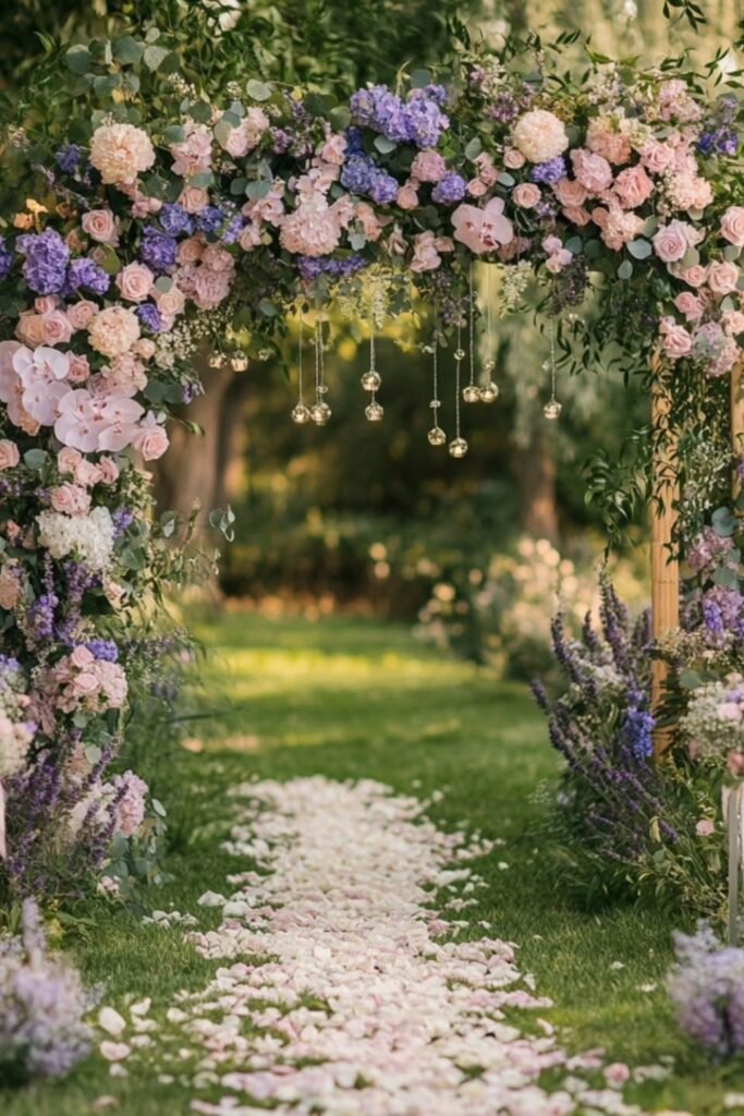 This option suits formal garden layouts where symmetry already exists and petals simply enhance the walk toward the ceremony space naturally.