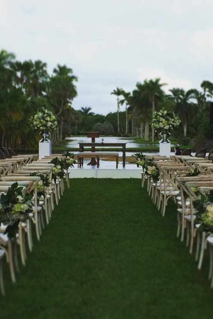This layout suits long, straight aisles where symmetry helps guests focus forward while palms and water frame the ceremony naturally.