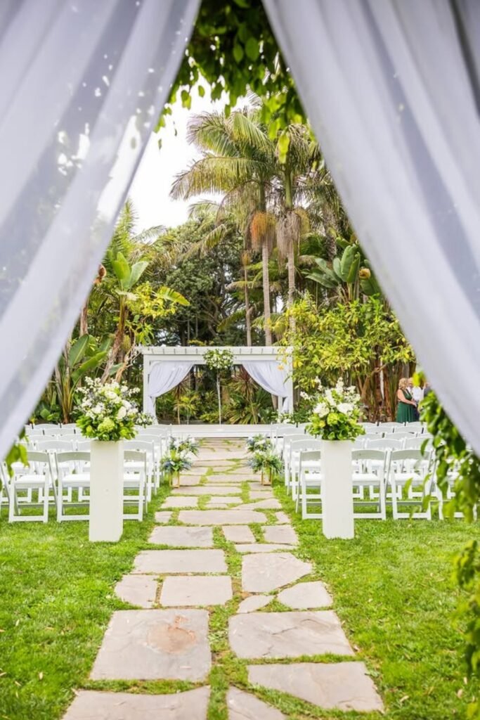 Use architectural draping to frame the ceremony when gardens feel lush, letting fabric add structure without overpowering surroundings.