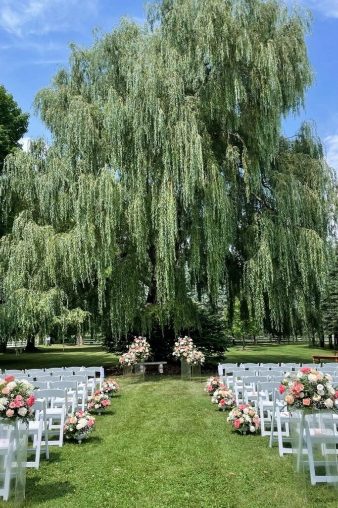 Works best under tree shade, where petals stay fresh longer and florals avoid harsh sun exposure during outdoor ceremonies.