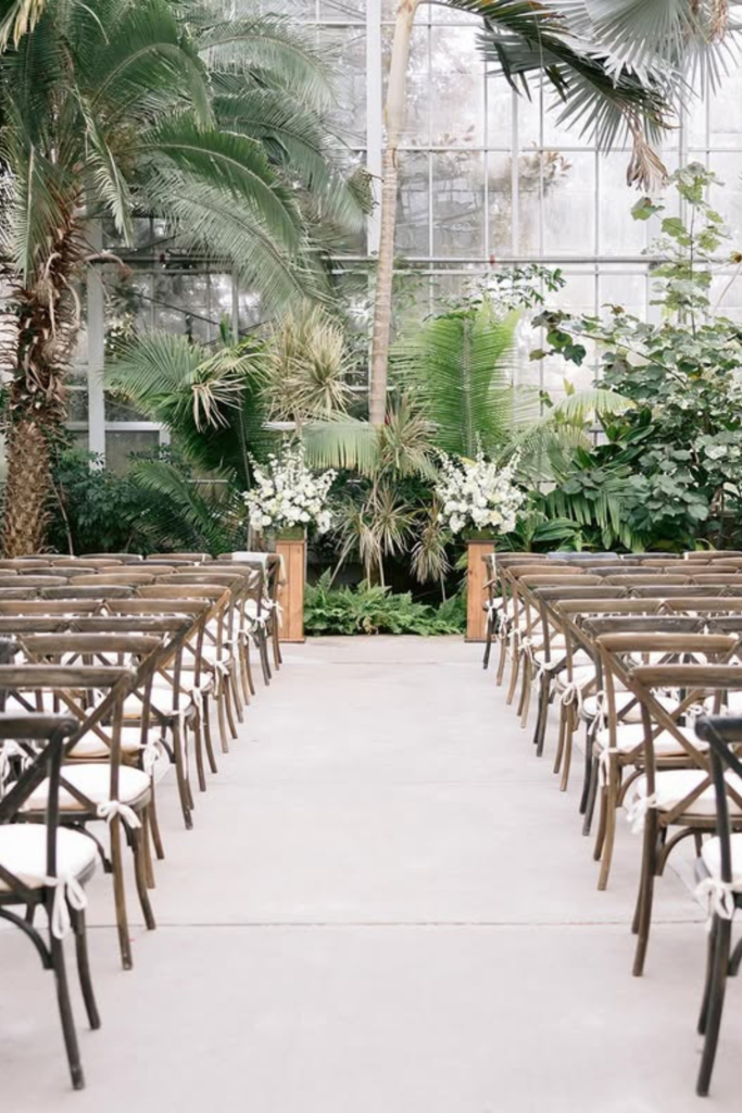 Greenhouse ceremonies shine when you let the plants frame the aisle, using symmetry instead of extra decoration to guide attention forward.