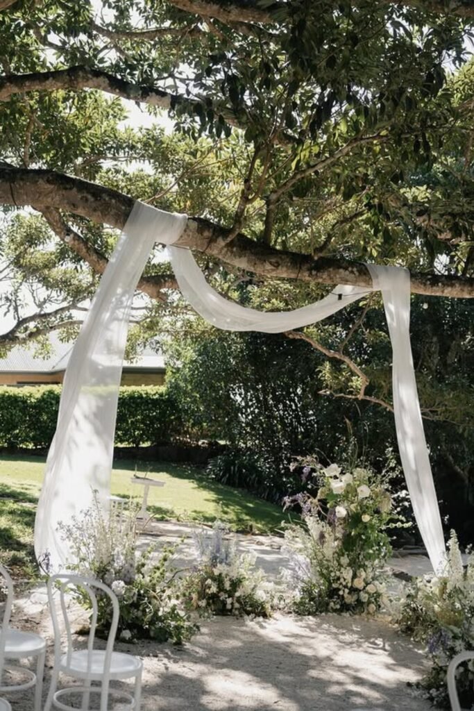When arches are restricted, soft fabric draped between branches creates a ceremony frame without harming the tree or violating venue rules.