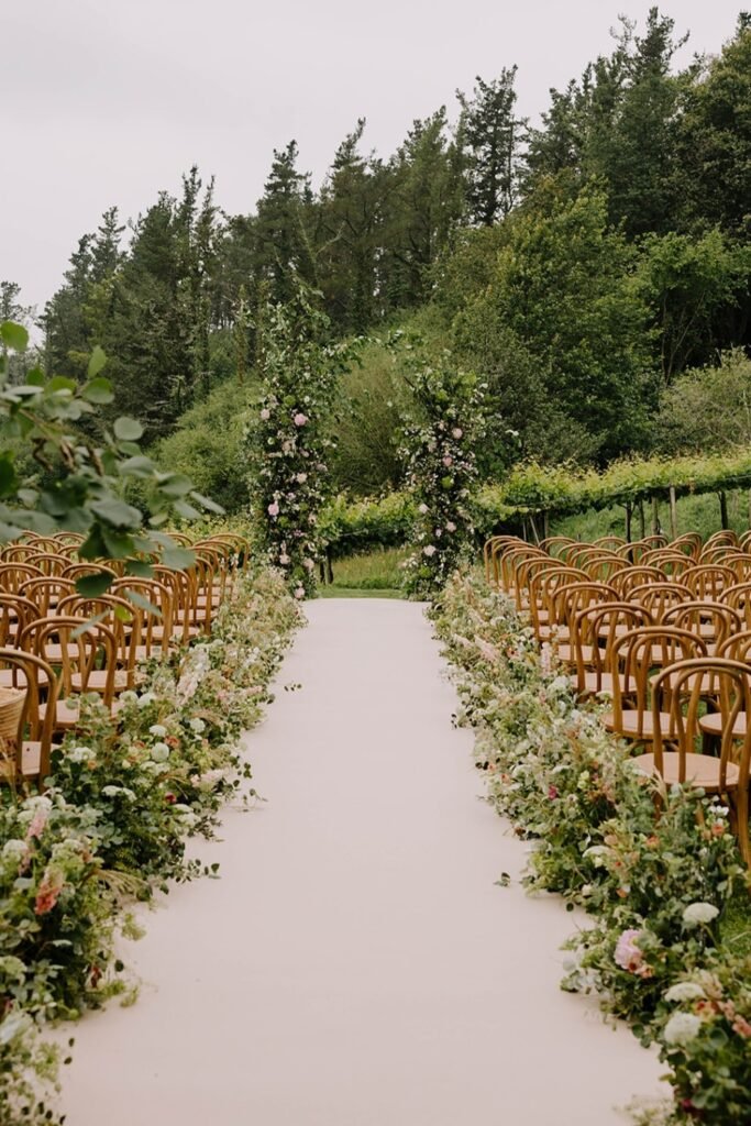 Garden aisles lined with loose florals feel romantic while staying practical for venues that restrict stakes or attachments on lawns, pathways, areas.
