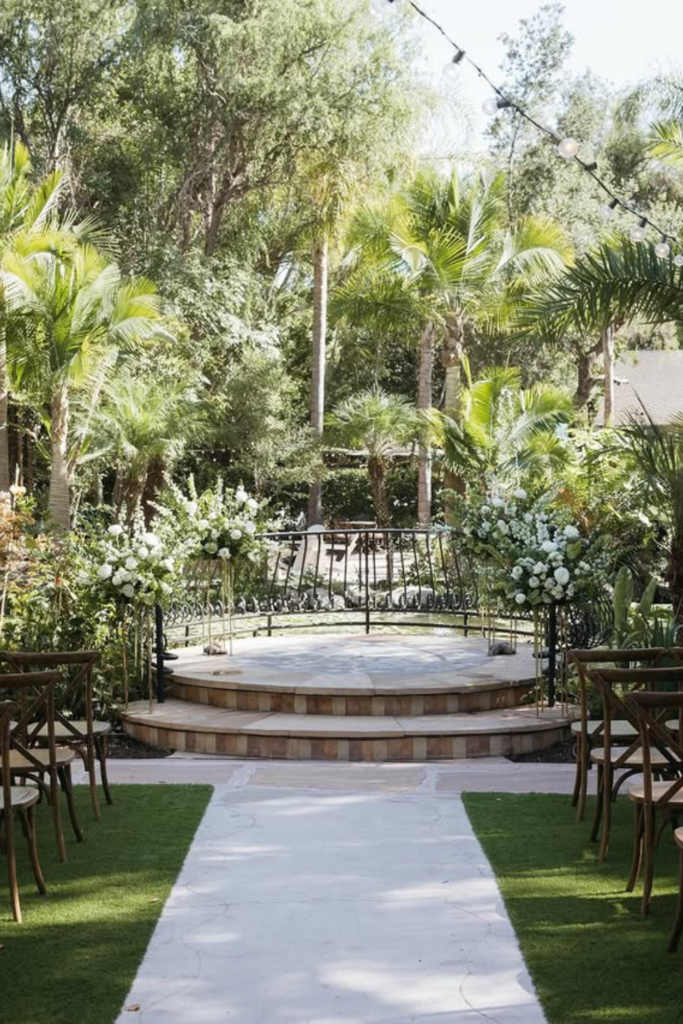Raised platforms help ceremonies feel intentional in wide gardens, giving everyone clear views without excessive décor clutter.