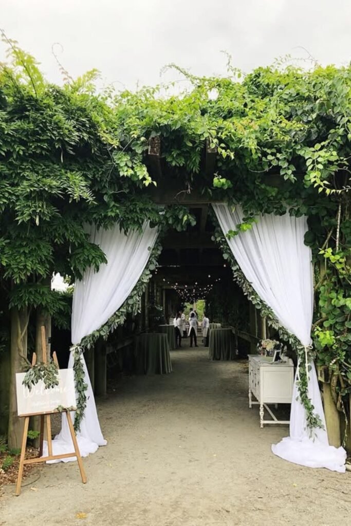 Turn the entrance into a moment by framing walkways with greenery and soft draping that signals something special ahead for guests arriving.