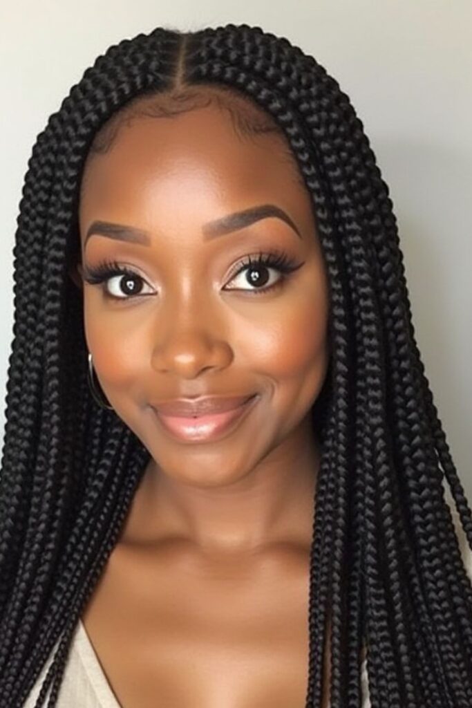 The sharp parting and structured layout make it a trendy choice for those who love detailed, stylish braids.