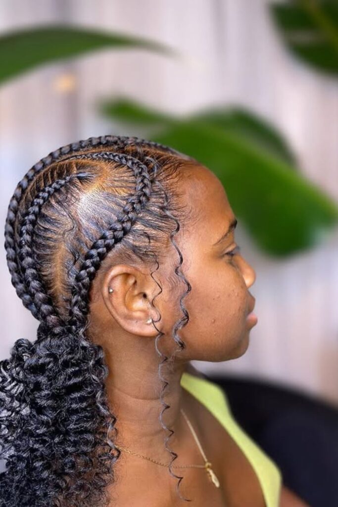 Channel your inner queen with goddess cornrow braids! This style blends classic cornrows with soft, wavy or curly extensions, giving a regal and ethereal look.