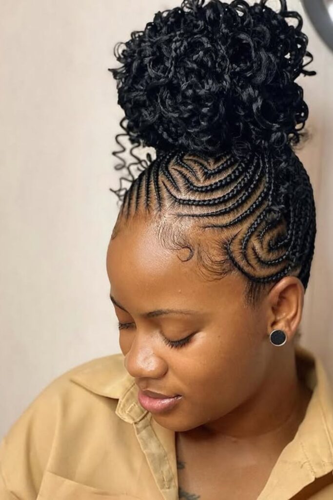 This curly cornrow bun is a mix of sleek braids and voluminous curls, creating a stylish updo.