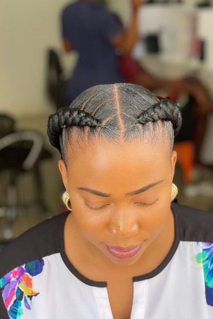 This hairstyle features neatly parted cornrows braided towards the crown of the head and secured into two braided buns.
