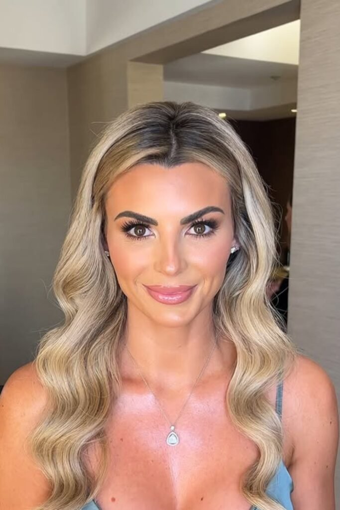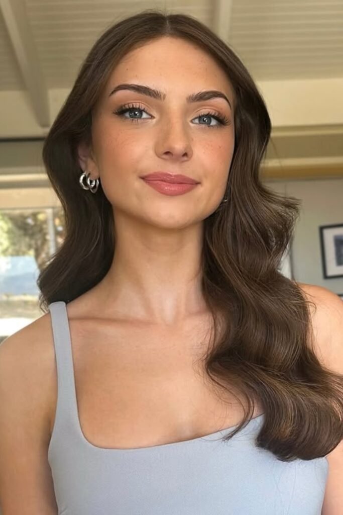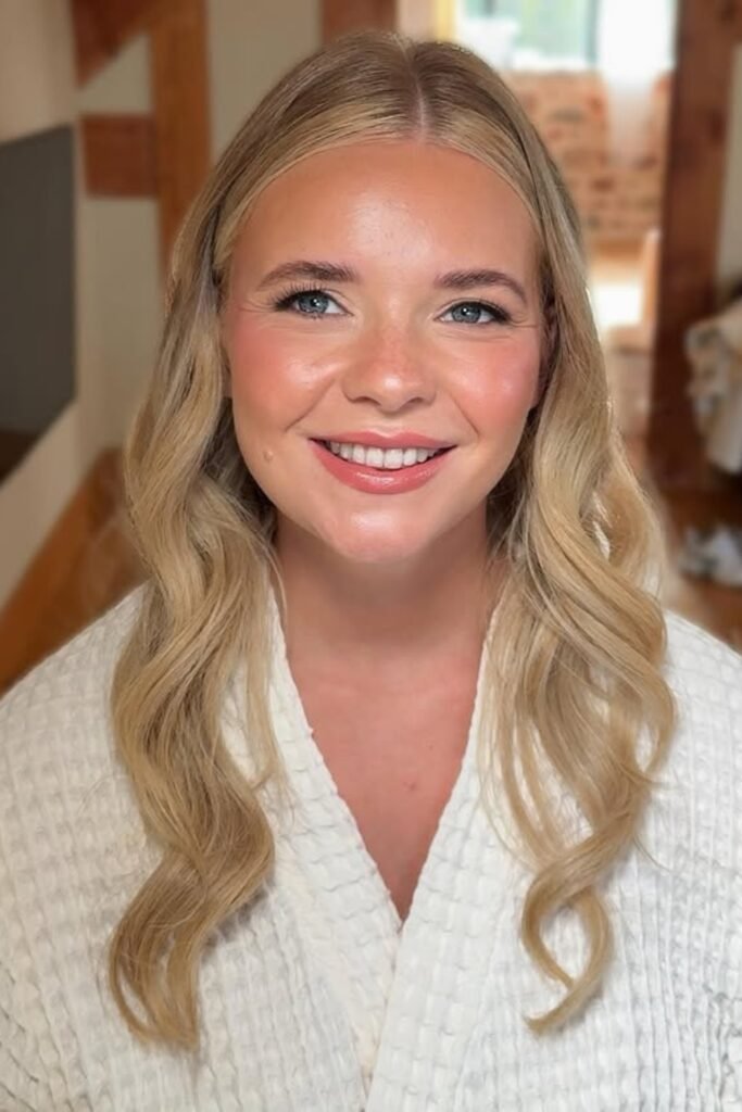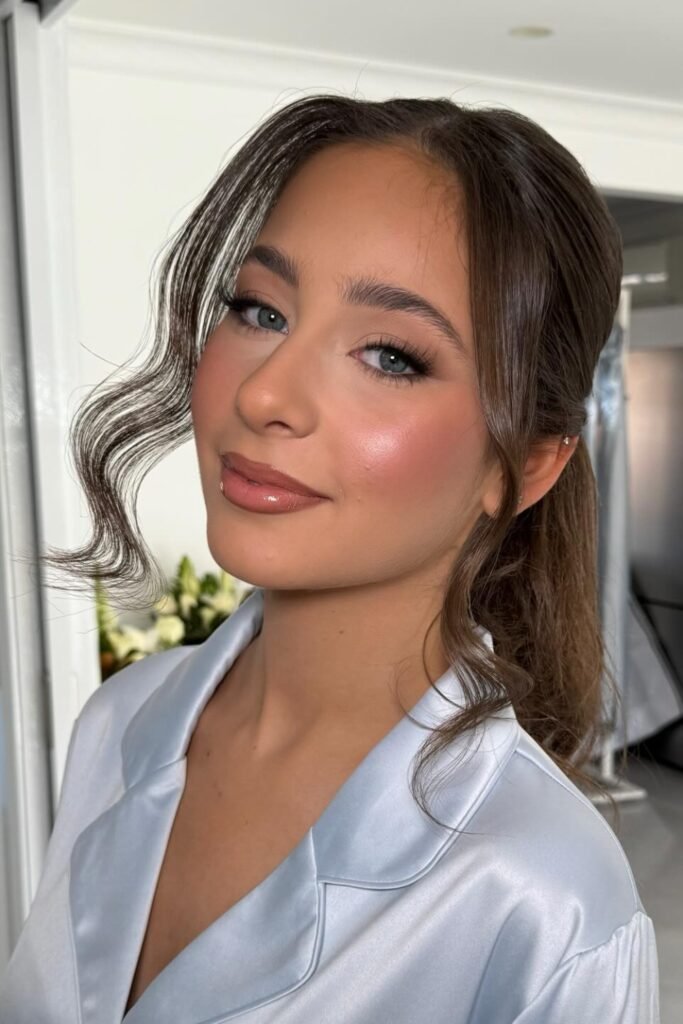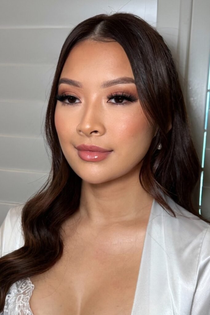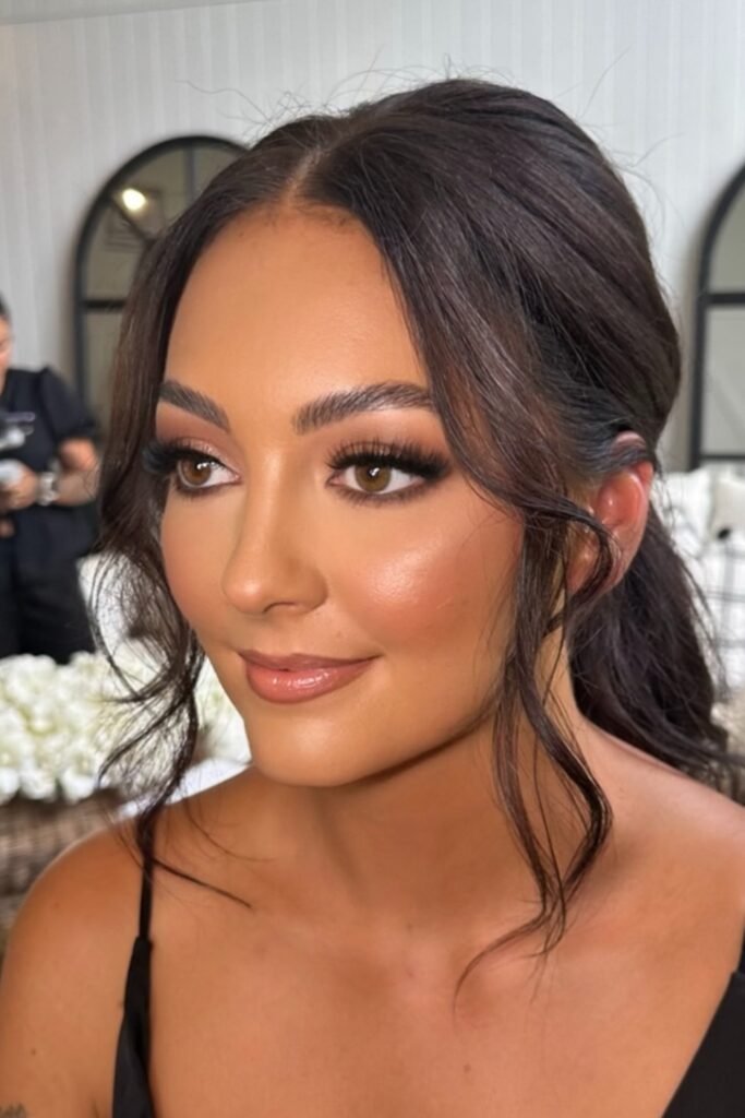 When you pair this makeup with glossy Hollywood waves, you get a classic bridesmaid style that never goes out of fashion.