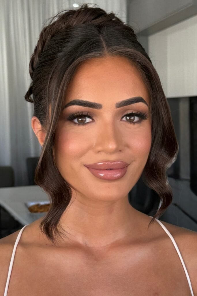 To keep the look balanced, pair it with glossy nude lips. A sleek updo with some pieces framing your face will give you a stylish finish.