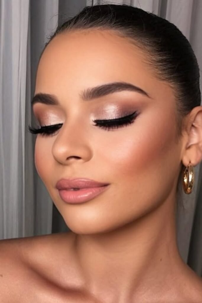 To balance the glow, you can finish with nude satin lips, creating an elegant and timeless style.